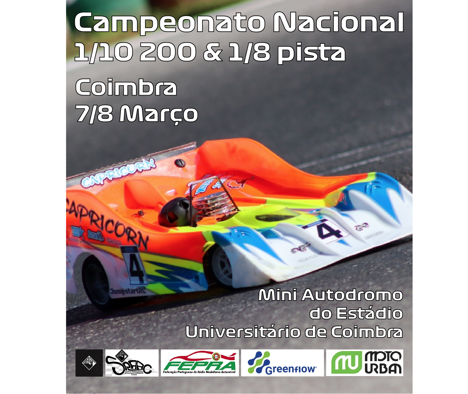 É já nos próximos dias 7 e 8 de Março que a competição volta ao Mini-Autodromo do Estádio Universitário de Coimbra com a realização da 1ª Prova do Campeonato Nacional de 1/10 200 & 1/8 Pista.